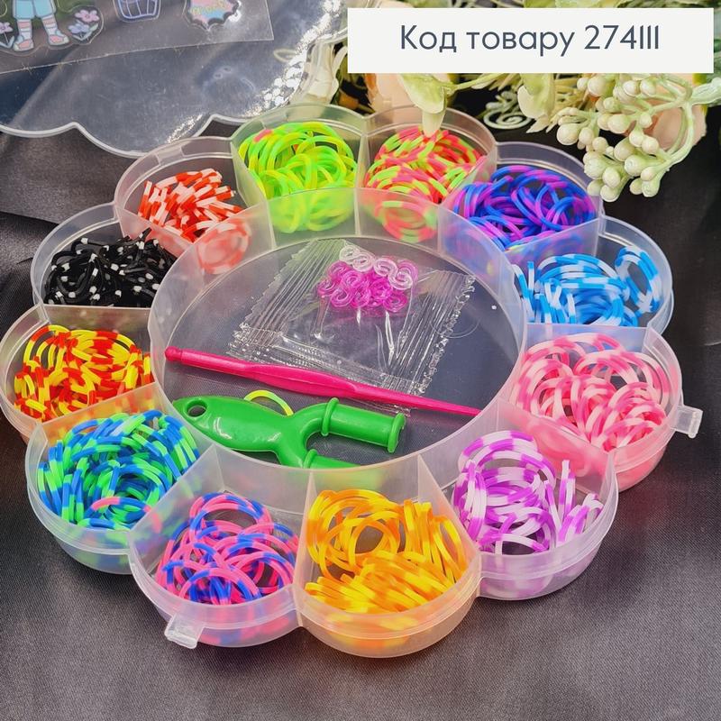 Резинки в коробочці силіконові для плетіння з гачком, петельками та тримачем в асорт