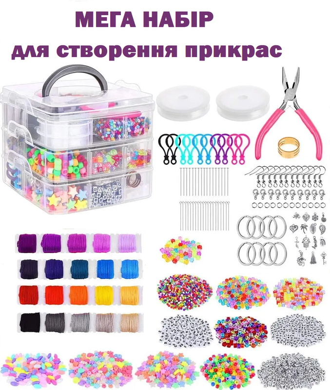 Описание Лучший набор для творчества и развития творческих способностей, мелкой моторики и дизайнерских навыков для подростков. В комплект входить: 1. Плоскогубцы - 1 шт 2. нити мулине - 16 цветов 3. кольцо для соединения фурнитуры 4. Силиконовая резинка 0.5 мм и 0.8 мм - 2 шт 5. Бусины цветные, бисер, смайлики, буквы, плоские полимерные бусины - 2000шт 6. карабины для брелоков - 10 шт 7. подвески - 10 шт 8. сантиметр - 1 шт 9. кольцо для брелока - 10 шт 10. Тарелочка для бусин и бисера 1 шт 11. Фурнитура для украшений (замочки, пены, колечки соединительные, швензы) 12. Органайзер 3х ярусный - 1 шт 13. Леска и бисерная нить 14. Мешочки из органзы для хранения украшений или для подарок