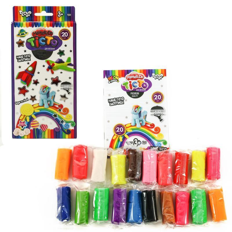 Тісто для ліплення "Master Do", яскраві кольори. 20 кольорових брикетів в наборі. Самостійно твердне протягом 24 годин на повітрі. Паковання — коробка. Розмір - 11х2х25 см.