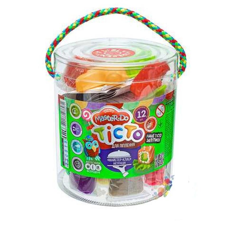 Тісто для ліплення "Master Do", яскраві кольори. 12 кольорових брикетів, аксесуари в наборі. Самостійно твердне на повітрі. Упаковка - туба.