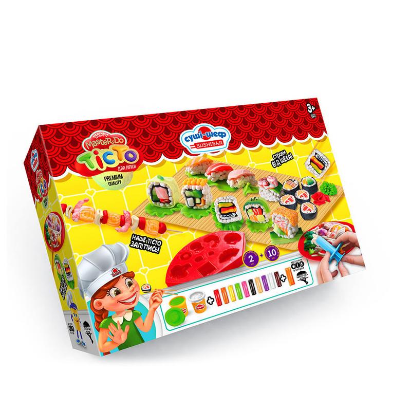 Тесто для лепки "Master-Do: Сушибар" - это набор креативного творчества. Своими руками, с помощью интсрукции, Вы легко сможете сделать любые , даже самые экзотичные, продукты для суши и роллов. Придумайте свой рецепт и реализуйте его. Тесто яркое, приятное на ощупь, нетоксичное. Комплектация: Тесто для лепки (10 шт.), тесто в баночке (2 шт.), шариковый пластилин (1 шт.), поднос для суши, палочки для шашлика (2 шт.), палочки для суши (2 шт.), комплект для 3-х стеков, форма для изготовления морепродуктов, каталка, набор столовых приборов, экструдер, инструкция