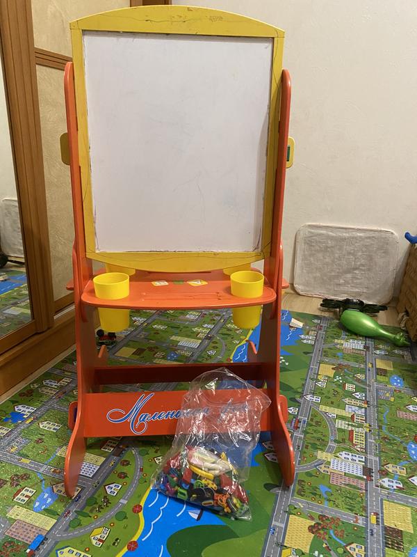 Деревянный мольберт двусторонний С одной стороны магнитная доска, со второй для рисования мелом. Магнитные цифры и буквы в наборе Легко складывается и разбирается