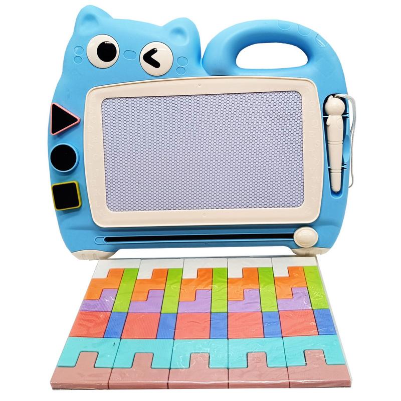 Магнитная доска для рисования. Рисовать с помощью ручки-стикера и штампиков- печатей 3-х видов + тетрис. При перемещении рычага справа внизу досточки, рисунок исчезает. Доска имеет удобную ручку для переноски. Доска укомплектована двумя штампиками и ручкой-стикером.