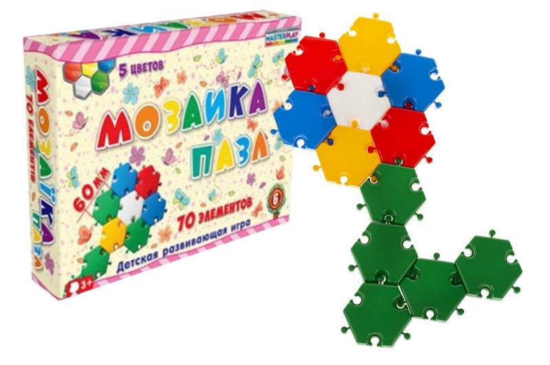 Детский набор для творчества пазл Мозаика 70 деталей 60 мм. Мозаика-пазл Ø60 мм (70 дет.) - детская развивающая игра будет отличным подарком для любознательного, активного ребенка. Мозаика состоит из 70-ти разноцветных шестиугольных элементов, легко соединяющихся между собой в любые, самые затейливые фигуры - цветы, животных, дома и многое другое. Прекрасная возможность для родителей провести время со своими детьми с пользой, совмещая игру и развивающие занятия! Складывая мозаику-пазл, малыш тренирует мелкую моторику, вовлекает в игру воображение и развивает творческие способности, а также учится терпению и усидчивости. Все элементы мозаики изготовлены из пластика высокого качества, безопасного для ребенка. В комплекте: пластиковые элементы (60 мм) 70 шт. Возраст от 3 лет.