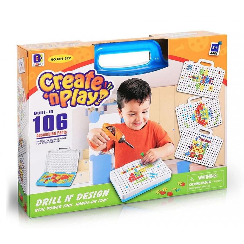 С помощью болтиков и шуроповерта необычной мозаики, ребенок сможет составить красочные узоры. Детали и инструменты набора 661-322 развивают навыки распознавания цвета, счета, формируют двигательные навыки. Шуруповерт работает в режиме закручивания и откручивания шурупов. Все детали набора помещаются в компактный и удобный для хранения чемоданчик, который служит, также, и игровым полем для работы с мозаикой. Шуроповерт работает от 2-х батареек типа "АА" 1.5V (не входят в комплект). В комплекте: - цветные пластиковые пластины для формирования различных картинок - 64 шт; - цветные пластиковые шурупы - 40шт; - шуруповерт; - книжка-подсказка. Размер упаковки: 31 х 7 х 25 см Упаковка: Коробка Внимание. Производитель оставляет за собой право изменять комплектацию, цветовую гамму и характеристики товара без предварительного уведомления. После оформления заказа мы свяжемся с Вами в течение 2-х часов и если у Вас возникнут вопросы, мы с радостью на них ответим.