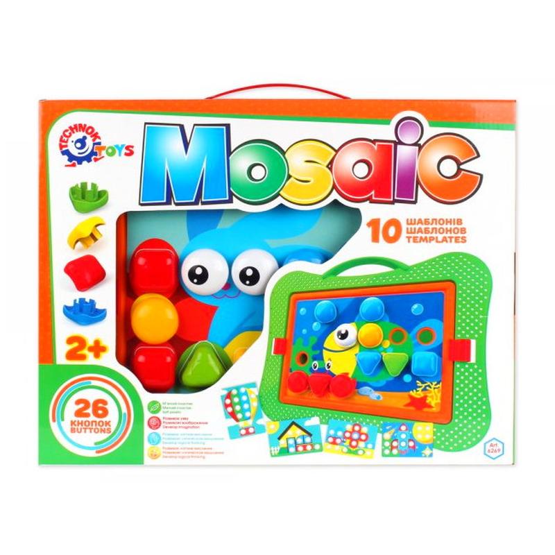 Игровой развивающий набор - мозаика. Развивает: фантазию, логическое мышление и мелкую моторику рук. Мягкий качественный пластик, производство Украины. В набор входит: - Доска для фиксации картинок - Лоток для хранения кнопок - 10 картинок-шаблонов - 26 кнопок Размер коробки: 37х29х5 см.