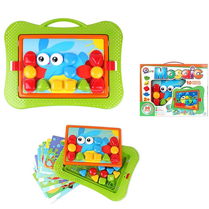 Предлагаем вашему вниманию мозаику, которая станет незаменимой игрушкой в арсенале всех любящих и ответственных родителей, ведь сочетает в себе очень много важных вещей. Дети полюбят эту игрушку за разнообразие красок, за возможность фантазировать и развивать воображение, за множество игровых элементов, которые так интересно собирать вместе. Взрослые отметят учебно- развивающий эффект мозаики. Так, эта, на первый взгляд простая игрушка, производит у ребенка внимательность и усидчивость, тренирует память и развивает мелкую моторику. двусторонних трафаретов (10 разных рисунков). Фишки-кнопки в этой мозаике не просто разноцветные, они еще и разной формы. К тому же, на двух фишках нанесен рисунок в виде глаз. Поэтому, после того как малыш составит мозаику, зверьки на картинках «оживут». Все элементы мозаики вы сможете хранить в удобном чемодане, который также служит игровым полем. Для детей от 2-х лет.