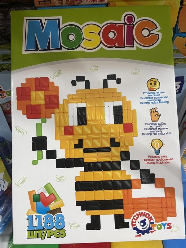 Як зібрати мозаїку? Малюнок викладається на пластикове поле дрібними фішками різних форм. Усього в комплекті 1188 елементів дев'яти кольорів! Розмір найменшого квадратика 4х4 мм. На допомогу дітям є спеціальний інструмент, яким зручно виймати фішки з поля. Для юних творців у наборі є інструкція, згідно з якою можна зібрати яскраву бджілку та царівну-жабу. Зібравши малюнки за інструкцією, потім можна збирати власні, які підкаже фантазія. ІграшкаTechnok Мозаїка -- це чудова гра для розвитку дрібної моторики, уваги та пам'яті. Збираючи картинку, потрібно розрахувати кожен наступний крок. Це допоможе дітям поліпшити навички рахунку та концентрацію. Пакування -- яскрава коробка, у якій зручно зберігати всі елементи мозаїки. У наборі: пластикове поле, 1188 елементів, інструмент для збирання, інструкція. Для дітей від 5 років.
