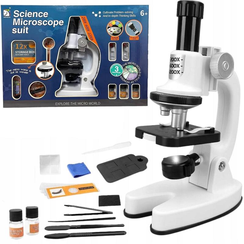 Мікроскоп із набором для дослідів у подарунковій коробці вразить не тільки дитину, підлітка, а й дорослого. Він дає змогу дітям побачити та вивчити подробиці препаратів в окулярі або на екрані смартфона. Має світлову підсвітку, що забезпечує достатнє освітлення для перегляду біологічних зразків і мікро препаратів. За допомогою мікроскопа можна збільшити зображення до 200 x 600 x 1200 x. Набір містить: мікроскоп зі збільшенням 200x, 600x, 1200x, 3 пляшки, 2 пробірки, 2 коробки зі слайдами, лупа з 3-кратним збільшенням, збільшувальне скло, контейнер для зразків, тримач для смартфона, пінцет, 2 ножі, паличка, інструкція. Розмір мікроскопа 14.5 * 9 * 24 см. Розмір коробки 42 * 9.5 * 29 см.