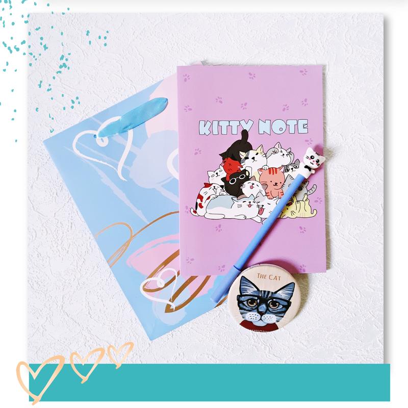 Подарочный набор для девочек Kitty Note арт.MF0803-4 Лаконичный и яркий подарочный набор для девочек от 6 лет. Такой комплект Kitty Note - недорогой и необычный подарок девочкам на 8 Марта, на выпускной в детском саду, день рождения и другие события. Комплектация набора: - Блокнот А5 в клеточку с дизайнерскими листочками (80 страниц, микс дизайнов) - 1шт - Ручка-игрушка гелевая Котики (микс цветов корпуса) - 1 шт - Зеркальце детское d 7см (разные дизайны) - 1 шт - Пакет подарочный (микс дизайнов) - 1 шт