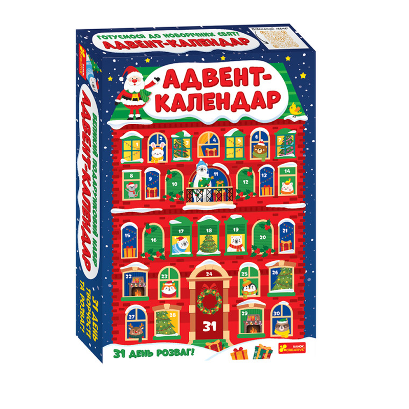 Адвент-календарь - это отличный подарок к Новому году! 100% будет креативно, весело и полезно! Он рассчитан на 31 день! Формат, мм: 240х340х50 Язык издания: Украинский Возраст: 8-10 Обложка: Коробка Творческий набор поможет подготовиться к зимним праздникам и провести время в ожидании Нового года легко и с удовольствием! В этом огромном наборе мы подготовили для вас веселые развлечения на каждый день декабря: игры, стихи и загадки. Вместе с нами получите много замечательных украшений, открыток и подарков, набор для веселой фотосессии и многое другое. Больше 30 разнообразных задач на каждый день декабря — от совсем легких до более сложных! Домик-календарь станет ярким украшением, а также поможет ребенку понять, сколько дней осталось до праздника. С книжечкой-инструкцией ожидание превратится в веселую и интересную игру! Делаем украшения, открытки, подарки Развлекаемся, играем, рисуем! Выполняем задачу Пишем лист номером Николая Устраиваем фотосессию Отгадываем загадки Учимся стихи