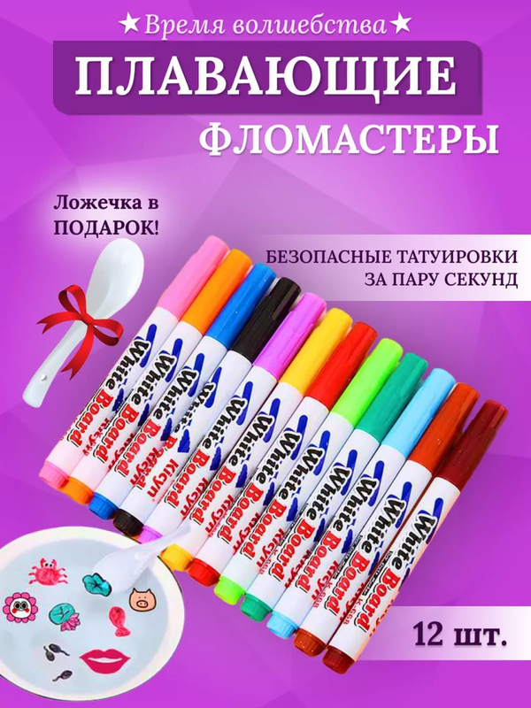 Представьте себе Маркеры, которые превращают обычное рисование в Волшебное приключение! Наши Волшебные Маркеры позволяют вашему ребенку творить как на бумаге, так и на доске. Но это еще не все! Самое удивительное в нашем наборе - Керамическая ложка. Просто нарисуйте на ней свой любимый рисунок, погрузите в воду, и ваше творение начнет плавать! Этот рисунок можно прикрепить к любой поверхности: руке, блокноту, стене - возможности бесконечны! А благодаря специальной формуле Маркеров, даже если ваш малыш изрисует мебель, ламинат или даже стены, не стоит беспокоиться - все легко стирается! Набор включает в себя 12 ярких цветов + керамическая ложка, чтобы ваш маленький художник мог воплотить все свои фантазии на свете. Универсальные, легко стираемые и полностью безопасные - наши волшебные маркеры станут любимым творческим инструментом вашего ребенка! Комплектация: Комплект из 12 Маркеров + Керамическая ложка