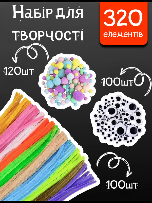 Набор для творчества идеален в качестве подарка для ребенка, подарка сыну, подарка дочке, подарка девочке, подарка сестре, подаркаарице. В подарок на День рождения девочке, подарок на Новый год, подарок на День рождения ребенку, подарок на 1 сентября. Проволока синельная – 100 шт - 6 мм х 30 см. Глаза на клеевой основе - 100 шт (6 и 8 мм) Помпони 120 шт (10 мм) Упаковка: прозорий пакет.