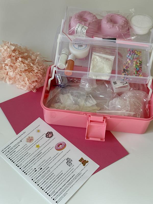 📦 Что внутри набора? ✅ Волшебный чемоданчик для хранения всех материалов, размер 28*16*13 см, вес 1200 грамм ✅ 6 разных форм для заливки: лапка 🐾, мишка 🐻, звёздочка ⭐, пончики 🍩 (2 шт.), цветочек 🌸 и молд с 6 маленькими фигурками ✅ Жидкий силикон (Компонент A - 100 мл, Компонент B - 100 мл) ✅ Порошок мотти - 1 пакетик ✅ Флоковый порошок для бархатистой текстуры - 1 баночка ✅ Декор: разноцветные шарики, присыпка, жемчужинки 💎, кусочки фруктов 🍋 ✅ Красители: оранжевый 🟠 и белый ⚪ (по 1 флакону) ✅ Пипетки - 6 шт. ✅ Кисточка для нанесения флокового порошка - 1 шт. ✅ Деревянные палочки для перемешивания - 20 шт. ✅ Вазелин для обработки форм - 1 баночка ✅ Мерные стаканчики (по 30 мл) - 10 шт. ✅ Одноразовые стаканчики - 10 шт. ✅ Прозрачные пакетики для хранения и подарков - 10 шт. ✅ Прозрачные пакетики для больших игрушек (с зип-замком) - 4 шт. ✅ Картонные держатели для пакетиков - 10 шт. ✅ Понятная инструкция на украинском языке 🔹 Создай мягкую и приятную на ощупь антистресс-игрушку своими руками! Этот набор поможет сделать уникальные сквиши в виде лапок, мишек, звёздочек, пончиков и других милых фигурок. 🔹 Всё необходимое в одном чемоданчике! Внутри жидкий силикон, красители, воздушный порошок мотти, флок для бархатной текстуры, декор, формы, кисточка, пипетки, палочки для перемешивания и подарочные пакетики. 🔹 Простой процесс создания: смешивай, добавляй красители и украшения, заливай в формы и жди несколько часов - и твоя уникальная игрушка готова! 🔹 Идеально для детей и творческих взрослых! Набор развивает моторику, воображение и приносит удовольствие от создания чего-то своими руками. 🎨✨