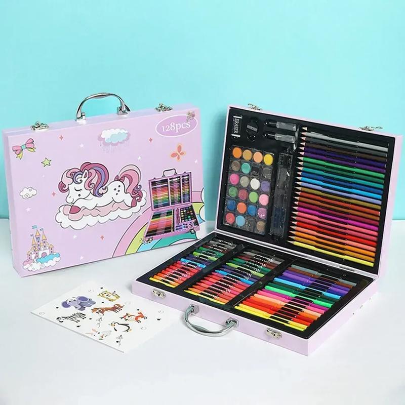 Набор для рисования в кейсе 128 предметов Этот детский набор для рисования - идеальный выбор для юных создателей, желающих воплотить свои идеи в жизнь с помощью множества инструментов и материалов. Преимущества: Полный набор для реализации творческих замыслов Удобные кисти разных форм и размеров Компактный и удобный кейс для хранения. Способствует развитию творческих способностей Яркая цветовая палитра для выразительных работ Большой выбор инструментов для различных техник рисования Подходит для детей любого возраста Описание: Этот набор для рисования разработан с учетом потребностей юных художников и содержит все необходимое для создания художественных шедевров. В него входит широкий ассортимент инструментов, позволяющих работать в различных техниках - от рисунка к живописи. В комплекте представлены краски. Кроме того, набор включает карандаши разных оттенков, простой карандаш для набросков, фломастеры разной толщины, цветные мелки и несколько кистей. Для удобства использования в комплекте входят резинка, точилка, линейка, палитра для смешивания красок, а также трафареты или штампы для добавления интересных эффектов. Характеристики: Тип товара: набор художника / чемодан для рисования / детский набор для рисования Рисунок на кейсе: единорог Количество предметов в наборе: 128 - Краски: акварельные - Карандаши: цветные разных оттенков + простой карандаш - фломастери. - восковые карандаши. - кисточки: несколько кисточек разной формы и размера - Дополнительные инструменты: резинка, точилка, линейка, палитра для смешивания красок Возрастная группа: от 3 лет Размер: 35.5х26.7х5.5 см Вес: 1.2 кг Комплектация: Набор для детского творчества Упаковка