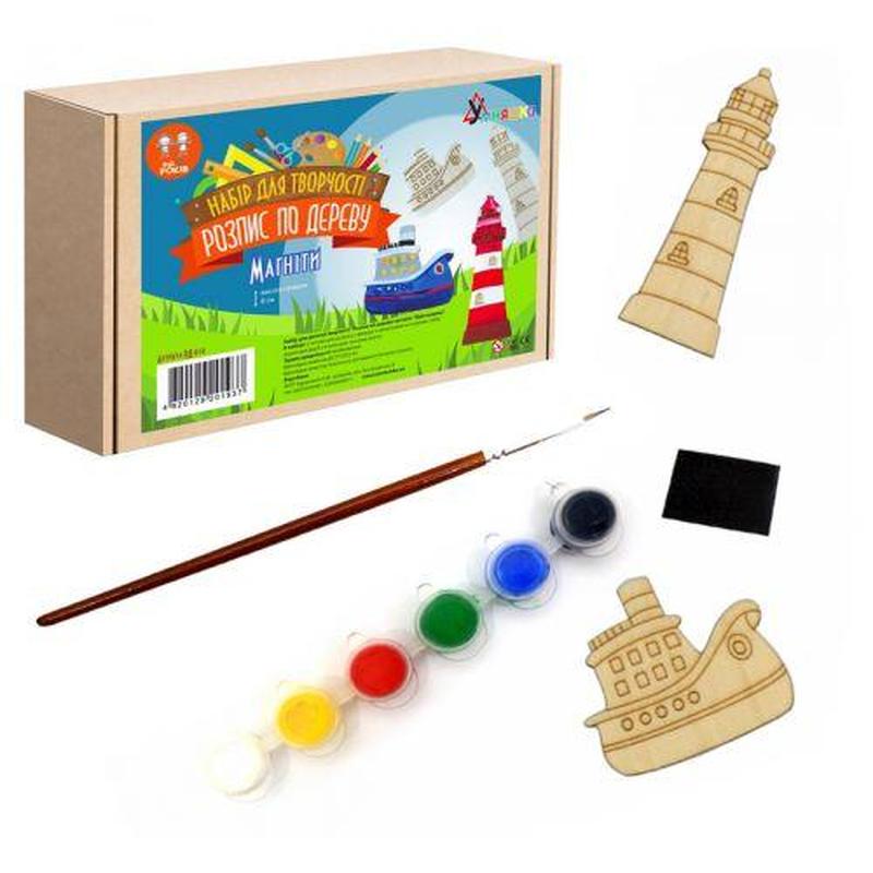 Набор для росписи по дереву "Магниты". В комплекте есть все необходимое для создания красивых, оригинальных магнитов: деревянные заготовки - 2 шт., набор акриловых красок - 6 цветов, кисточка, магнит. Выполнено из качественных и безопасных материалов. Для детей от 5 лет. _ Бренд: Умняшка Упаковка: Коробка Цвет: Разноцветный Вес в упаковке: 75 г Габариты в упаковке: 11.5 x 16.5 x 4 см Cтрана производитель: Украина Материал: Комбинированный Комплектация: деревянные заготовки - 2 шт., набор акриловых красок - 6 цветов, кисточка, магнит