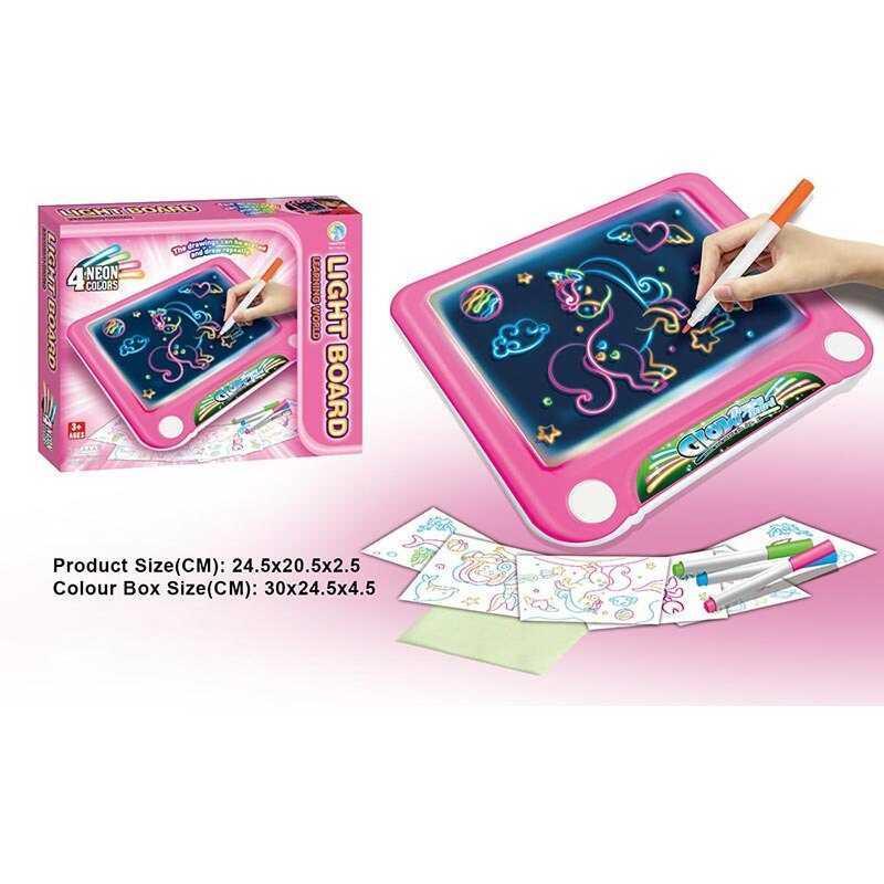 Подаруйте своїй дитині світ творчості! Завдяки цій унікальній магічній дошці для малювання ваш малюк зможе втілити свої ідеї у життя! Дошка, що підсвічується, створює неймовірний 3D ефект, завдяки якому малюнки на ній виглядають об'ємно та живо. Це справжнє відкриття для маленьких художників, які прагнуть виразити свою креативність. У комплекті ви знайдете кілька двосторонніх карток із трафаретами, які допоможуть дитині тренувати акуратність та терпіння. Основні характеристики: - Дошка з підсвічуванням – ідеально для творчих ігор; - Розміри дошки: 24.5х20.5 см; - Підсвічування живиться від трьох батарейок типу “ААА” (не входять до комплекту); - В наборі 6 двосторонніх карток-трафаретів; - 4 кольорові маркери та стирачка для зручності використання.