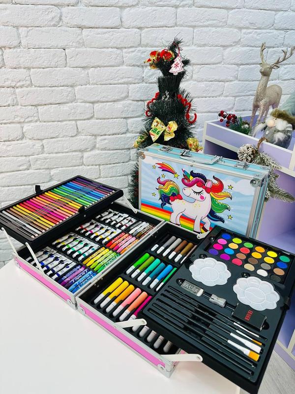 1356 Мультинабор для творчества поможет ребенку научиться рисовать, активизирует его познавательную деятельность и воплотит в жизнь его творческие идеи. Рисование положительно скажется на развитии детского воображения, фантазии, сообразительности, абстрактном мышлении, координации движений, творческих навыков. Художественный набор в чемоданчике на 145 предметов идеальный подарок как для детей, так и для подростков. Набор для рисования и искусства, изготовленный из экологически чистых материалов и полностью безопасен для детей. Упакован в удобный, прочный алюминиевый кейс с защитными углами, которые спасают от деформации при падении. Два замочки надежно закрывают чемоданчик и предотвращает его от случайного открытия. Комплектация: 28 цветных карандашей 2 привычных карандаша 4 кисточки разного размера 2 гумки 1 точило 2 палітри 24 акварельные краски 24 масляные краски 24 пастель 33 фломастера Размер: 34х23х8,5см