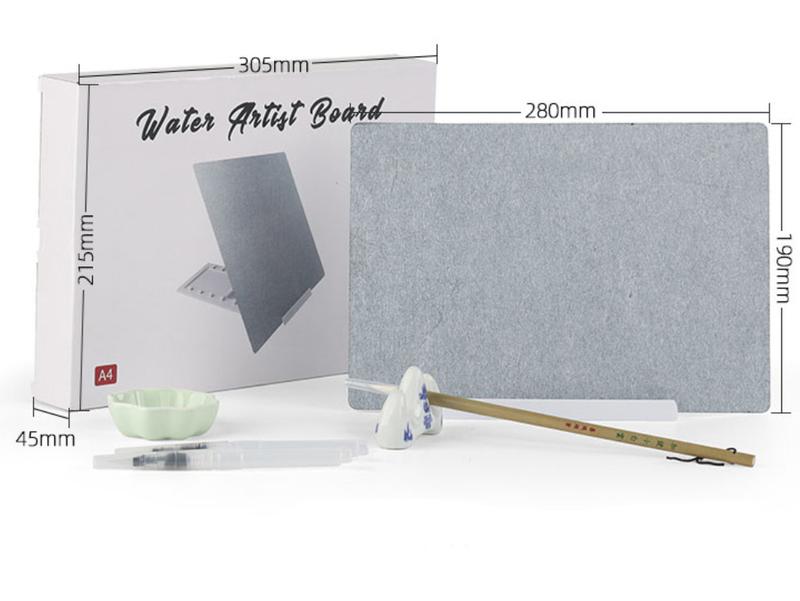 Представляем уникальную позицию из нашего каталога, впервые появившуюся на рынке Украины, и не имеющую пока каких-либо аналогов! Это специальная доска, на которой можно рисовать или писать…, нет, не чернилами и не быстро исчезающим маркером, а обычной водой! Модель имеет несколько названий -- Доска для рисования и письма водой, доска Будды, доска художника Самадхи и т.п. Это не только прекрасный инструмент для изобразительного искусства, но и отличное средства для снятия стресса и внутреннего напряжения. Ведь именно через штрихи и рисунки мы самовыражаемся, обретаем душевный покой и умиротворение! Советы по практическому применению доски Рисовать или писать на такой доске очень просто: окуните кончик кисти или наконечник ручки в воду, а затем нанесите его на поверхность доски. Изображение «живет» пока жидкость полностью не испарится. После этого доска снова готова к повторному использованию. Ценный подарок для творческих личностей Чтобы начать рисовать на доске, Вам нужно только найти «свое» перо, подходящее по толщине и форме наконечника. Все остальное подскажет Ваша фантазия! Уникальная доска для рисования и письма пригодится: Использовать такую доску может каждый, вне зависимости от возраста, пола и навыков рисования. Достаточно будет сделать первые штрихи и процесс рисования мгновенно вовлечет. Линия за линией будет вырисовываться картина. Если что-то не получилось, то всего несколько минут и можно будет начать заново. Это дает возможность использовать доску даже детям от 3-х лет. Юные художники смогут не только развивать свою насмотренность и навыки, но также будут тренировать концентрацию, моторику, память. Всё это позволяет использовать доску для рисования в школах и детских садах. Дети научатся наблюдать и размышлять, а для многих такая доска станет абсолютно новым способом самовыражения. За счет полного соответствия продукта всем стандартам безопасности можно не беспокоиться о негативном влиянии красок или фломастеров на здоровье ребенка. Останутся в восторге от такого подарка и взрослые. Рисование водой вполне может стать составляющей арт-терапии, во время которой можно будет освободить свои мысли и полностью перезагрузиться. Доска для рисования и письма будет также полезна всем представителям творческих профессий (художникам, скульпторам, дизайнерам одежды и обуви, стилистам и т.п.). Она станет неоценимым подспорьем в реализации креативных идей. Презентация доски для рисования водой формат А4 Уникальные достоинства доски Доска для рисования и письма при помощи воды обладает рядом преимуществ. К ним относятся: Экологическая чистота, безопасность для здоровья. За счет этого доска заметно выигрывает в сравнении с растворимыми красками и фломастерами. Это идеальная находка для малышей, только делающих первые шаги в рисовании! Кстати, она отлично подходит для использования дома и в детском саду, а также в кружках детского творчества и развития. Повышенная практичность. Так как вместо цветных красок используется только чистая вода, родители могут не переживать, что их чадо испачкается. Максимум, что может произойти - это опрокидывание пиалки с водой. Но небольшую лужицу можно легко вытереть, а мокрая одежда быстро высохнет, оставшись чистой! Компактные размеры и небольшой вес. Подставка легко складываетс
