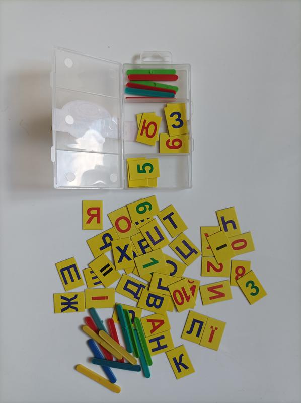 Звуковой анализ букв и цифр. Набор в пластиковом контейнере состоит из: пластиковых букв, знаков препинания, набора цифр от 1-10, математических символов и счетных палочек (30шт). На украинском языке.