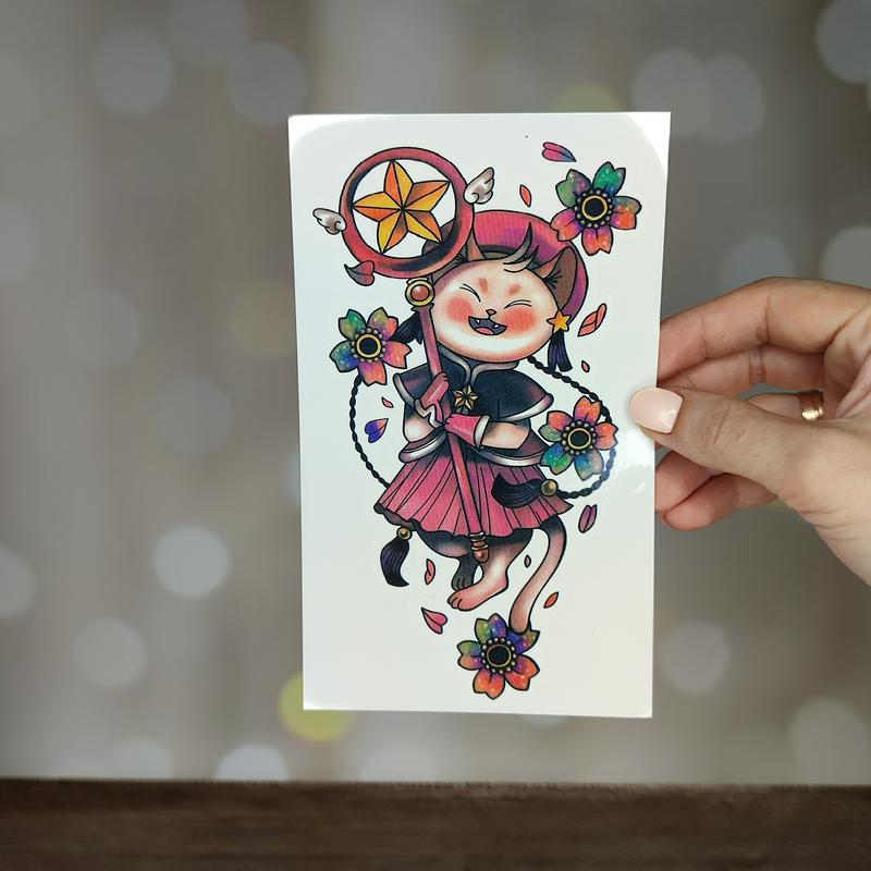 Временная татуировка, фальшивое тату на тело "кошка с магическим жезлом сакуры" (тату0129)