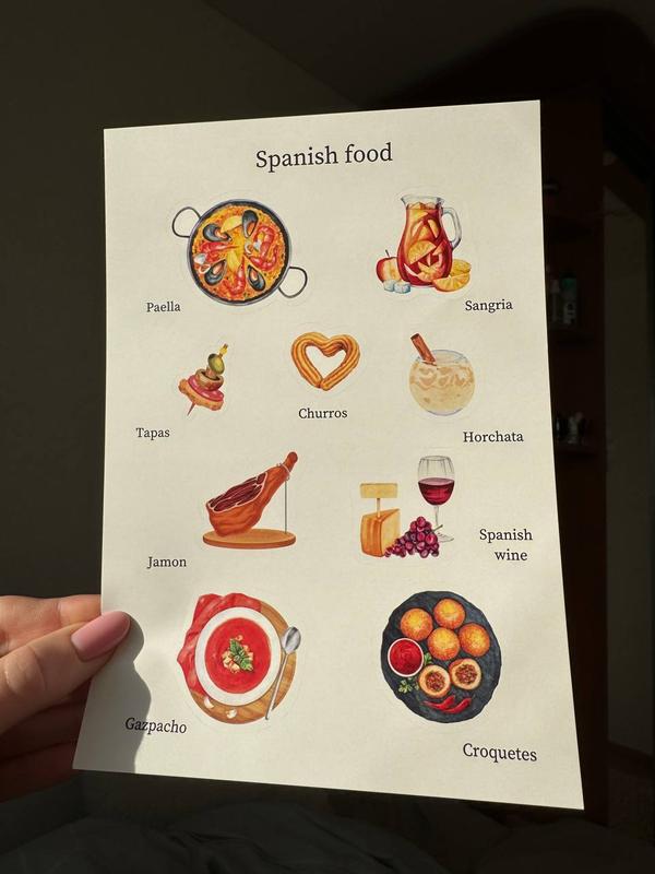 Наклейки на тему еда Испании (хомн, чуррос, паэлья, гап-пачо), формат А5, путешествия. вдово подойдут для личных блокнотов, тревел журналов например worldbook. Всего 1шт