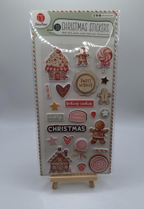 Рождественские наклейки 3D имеют форму различных рождественских лакомств и символов, таких как пряничные человечки, имбирные домики, леденцы и звездочки. На некоторых элементах есть надписи "merry Christmas", "sweet wishes" и "baking cookies". Эти наклейки можно использовать для украшения подарков, открыток или других изделий. Упаковка содержит разнообразные дизайны и материалы такие как дерево, пробка и стразы, что создает праздничное настроение