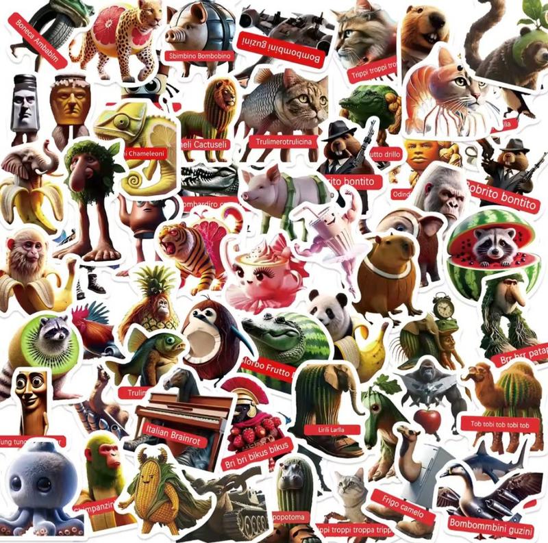 Набор наклеек 60 штук с героями Brainrot, набор наклеек из Tralelello Tralalala и другими героями итальянских мемов.