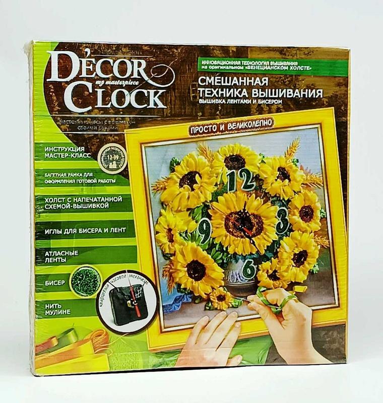 Набор для творчества "Decor clock" подсолнухи DC-01-05 - настенные часы, вышитые лентами и бисером на оригинальном «Венецианском холсте». Набор уже содержит все необходимое для изготовления функциональных настенных часов и предназначен для начинающих и опытных мастеров. Основное преимущество вышивки смешанной техникой в том, что даже самую сложную работу можно выполнить за считанные часы. • специально разработанный «венецианский холст» обеспечивает высокое репродукционное качество (изображение имеет фотохудожественную точность выраженный рельеф картины). - подробная схема для вышивания нанесена прямо на холсте, что упрощает работу с подбором бисера и лент, делая процесс вышивания интуитивно понятным, не занимая много времени. . • багетная рамка послужит пяльцем, а так же украсит готовый шедевр. Настенные часы, сделанные своими руками, непременно станут частью вашего интерьера и гордостью каждой мастерицы, а главное - Ваша работа будет авторской и ЭКСКЛЮЗИВНОЙ!