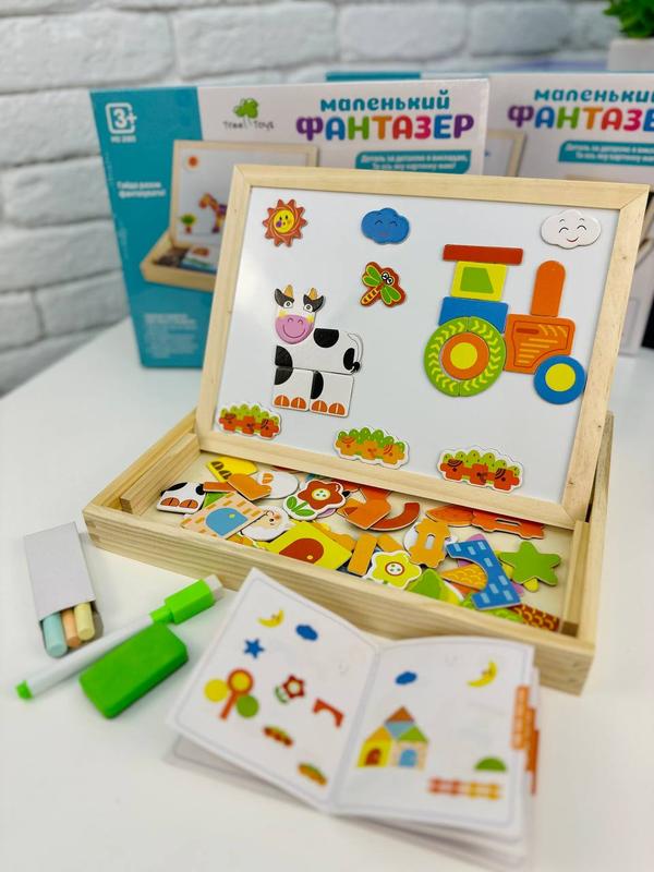 🌳Деревянная доска 2в1🧲👩🎨 Артикул: 8T1605 👉НАЯВНОСТЬ👈 ✍️Описание: Деревянный-двусторонний чемоданчик с магнитами🧲 В виде мольберта🎨 С одной стороны можно писать мелом🧑🎨вторая сторона магнитная-для рисования водным маркером🖍 и сборки картинок🖼 Развивает мелкую моторику🤌Логическое мышление 🧐 Фантазию💭Творческие способности Вашего малыша🧒 🗃️Комплектация: 🧩Набор магнитных пазлов🧲 🖍️Маркер с губкой Крейда✍️ Книжка с примерами📕 📐Размер: 31х24х3см