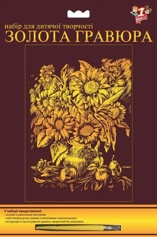 Гравюра с эффектом золота «Ваза с подсолнухами», размером 295х210 мм. В набор входит: 1 гравюра с нанесенным рисунком и ручка-гравера. С помощью этого набора Ваш ребенок может окунуться в увлекательный мир творчества. Самостоятельно создать необычную картину-гравюру.