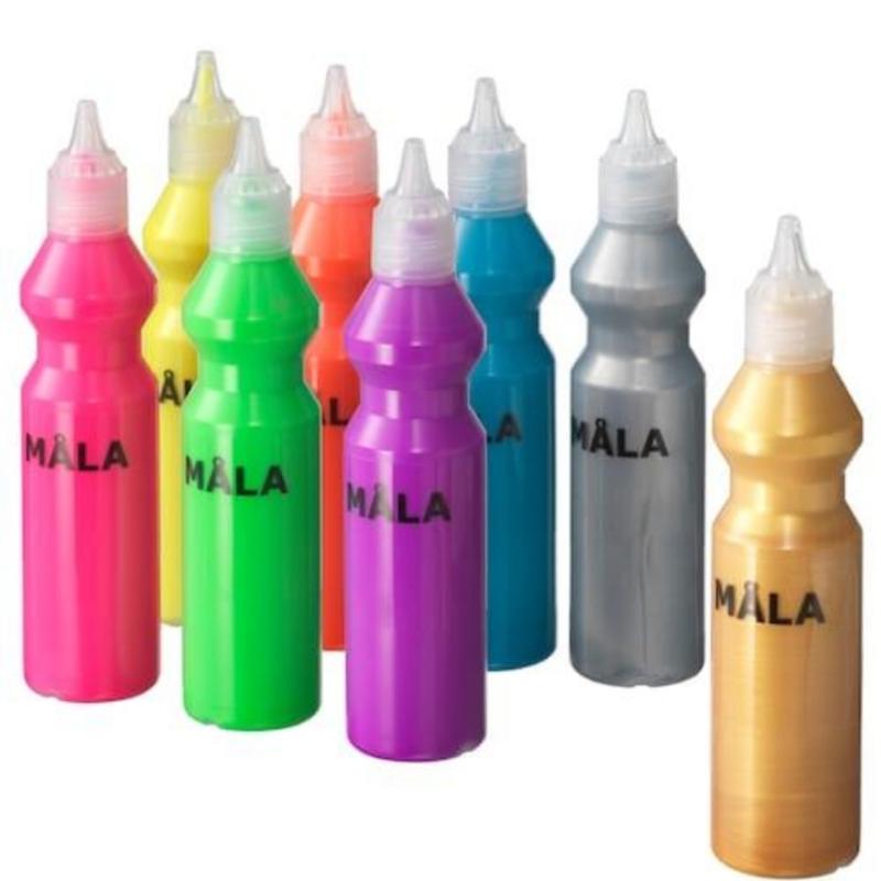 IKEA MALA - набор качественных люминесцентных красок. 8 штук. Включает краску на водной основе. Материал изготовления: Пластик Цвет: Разные цвета Размер и вес: Емкость: 640 мл Размер и вес упакованной посылки: Длина: 28 см. Ширина: 15 см. Высота: 4 см. Вага: 0,82 кг