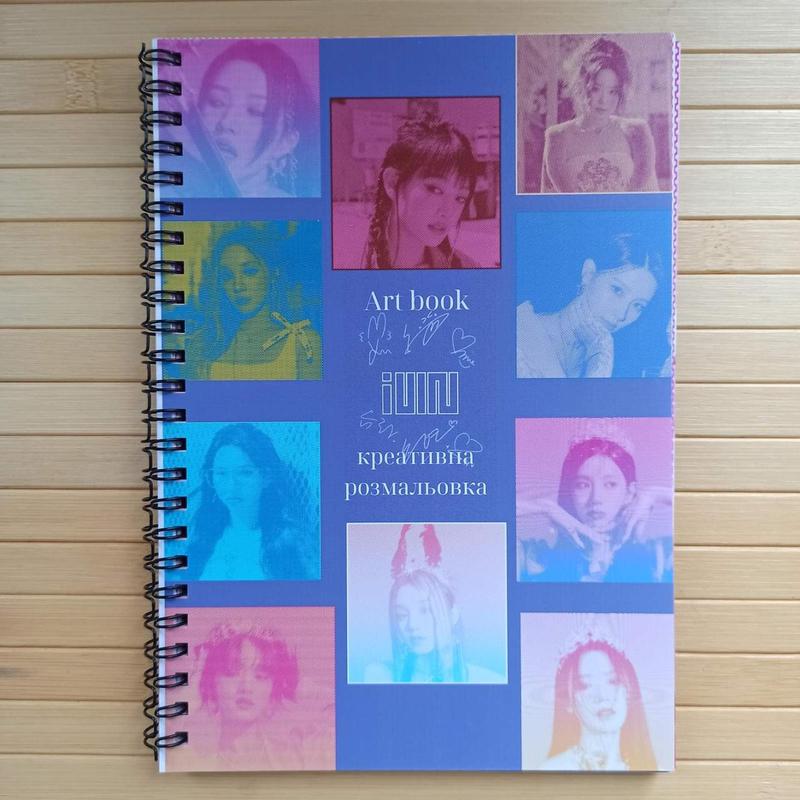Артбук Айдиль- це креативна розмальовка улюблених виконавиць з кольоровими глянсовими зображеннями. 10 аркушів-розмальовок + 10 аркушів прикладу розмальовки + 20 глянсових зображень виконавиць корейського поп гурту (G)I-gle
