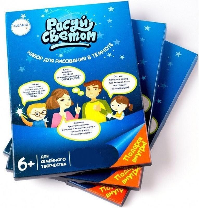 НАБОР ДЛЯ СЕМЕЙНОГО ТВОРЧЕСТВА «РИСУЙ СВЕТОМ» Это уникальный развивающий набор, позволяющий детям и взрослым весело проводить время за необычным рисованием. Больше не будет изрисованных стен и пролитой краски. Компактный и практичный набор «Рисуй светом» превращает процесс обучения ребенка в увлекательную игру. Набор не требует навыков художника, но при этом развивает фантазию, мелкую моторику, и делает даже из простых узоров настоящие световые шедевры. В НАБОР «РИСУЙ СВЕТОМ» ВХОДИТ Планшет со светонакапливающим покрытием; Маркер-фонарик для рисования; Трафарет; Инструкция. Набор сделан на основе фотолюминесцентного покрытия, накапливающего свет. Планшет не является электрическим и имеет защитную пленку, что гарантирует долговечную работу. Планшет А5 Размер: 150 x 210 мм - Планшет 15х21 см.; - Cветовой маркер-1 шт; - Трафареты; - Инструкция; - Красивая упаковка.