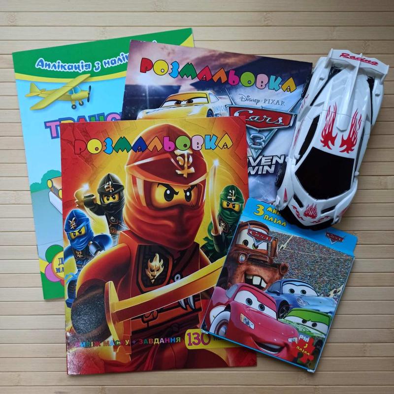 В набір входить: - розмальовки з наліпками 2 шт. на 130 наліпок (в асортименті) - аплікація з наліпками (в асортименті) - пазли 3 шт. в коробочці (в асортименті) - іграшка машинка