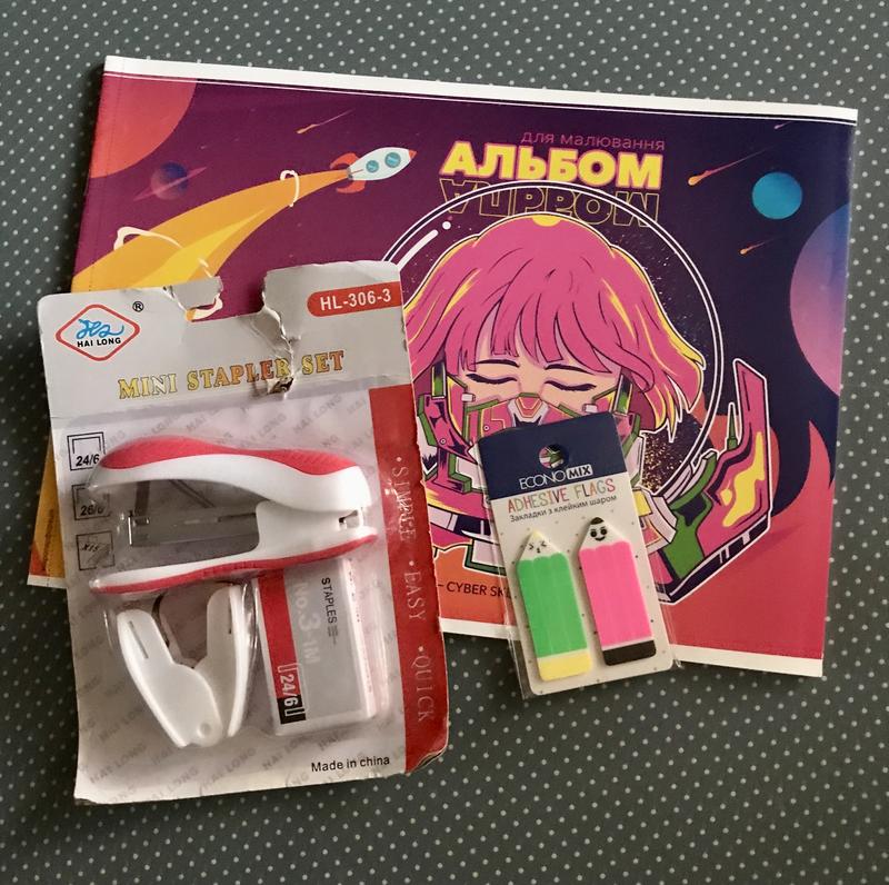 В наборі Альбом для малювання 20 стор. Набір стікерів Набір степлер+ антистерлер+ скоби