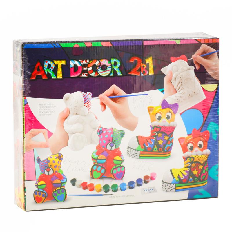 Набір для дитячої творчості "ART DECOR" 2в1, для 3D-розпису. Комплектація - 2 гіпсові фігури, фарби, пензлик, лак, інструкція. Вік - від 5 років. Упаковка - коробка. Розмір - 29х6,5х23,5 см.