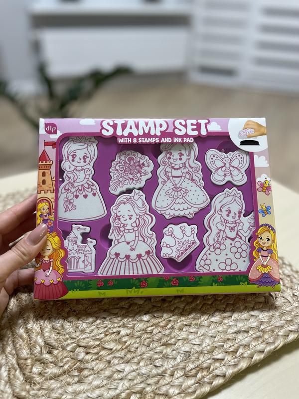 Детские штампы с изображениями милых принцесс. Чтобы использовать штамп, нужно приложить его к падению, который идет в комплекте и перебить на бумагу. В ассортименте 8 видов.