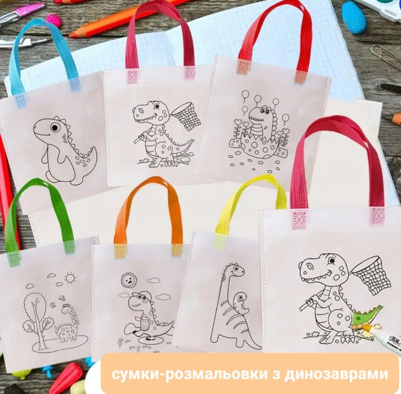 Детская сумочка раскраска с рисунками динозавров. Сумочку можно вылеплять как шоппер или в садик. Размеры: 21×21 см Цена за 1 сумочку без фломастеров.