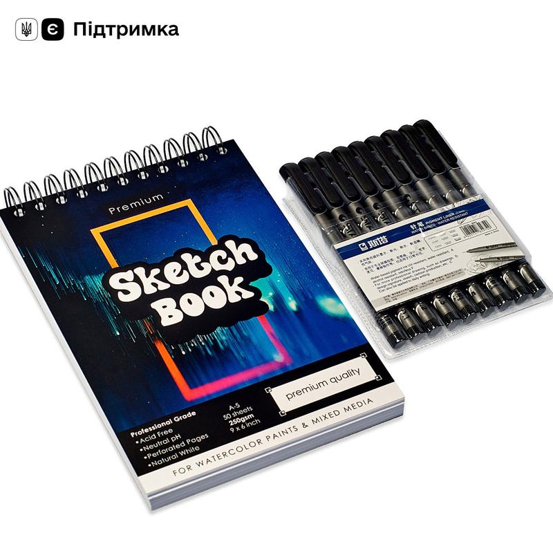 Акция! скетчбук для рисования на 50 листов а5 + набор черных профессиональных лайнеров 9 ш...