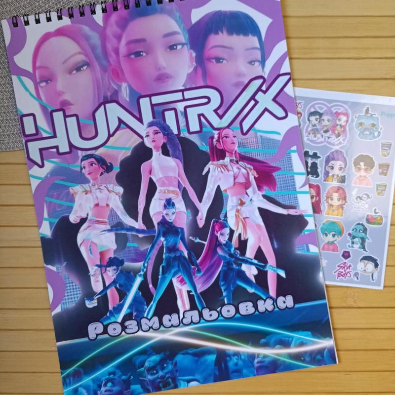 Раскраска (формат А4) 8 изображений + стекерпак Анимационный фэнтезийный музыкальный фильм сюжет которого рассказывает о вымышленном кейпоп-гурт девушек под названием Huntr/x, вовремицы которого ведут двойную жизнь – звездах сцены днем и охотниц на Демонов в ночные часы. Им приходится противостоять диспонтанному бойз-бенду Saja Boys, чьи участники на самом деле оказываются таинствами.