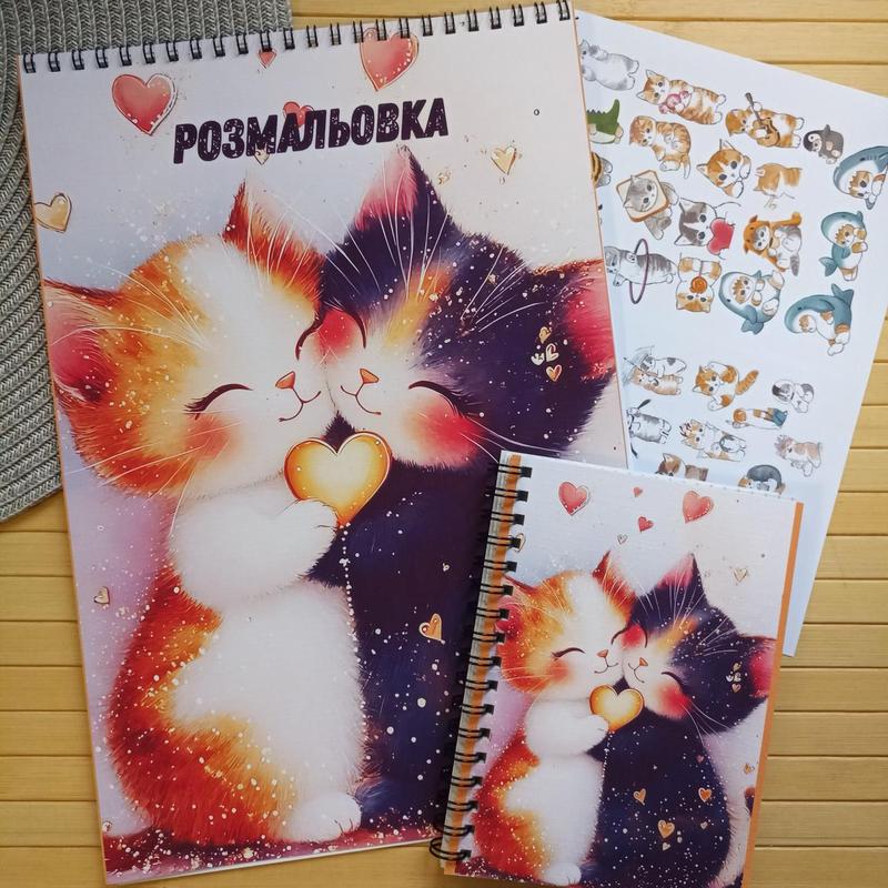 Розмальовка (формат А4) та блокнот на пружині Котики + стікерпак у подаунок