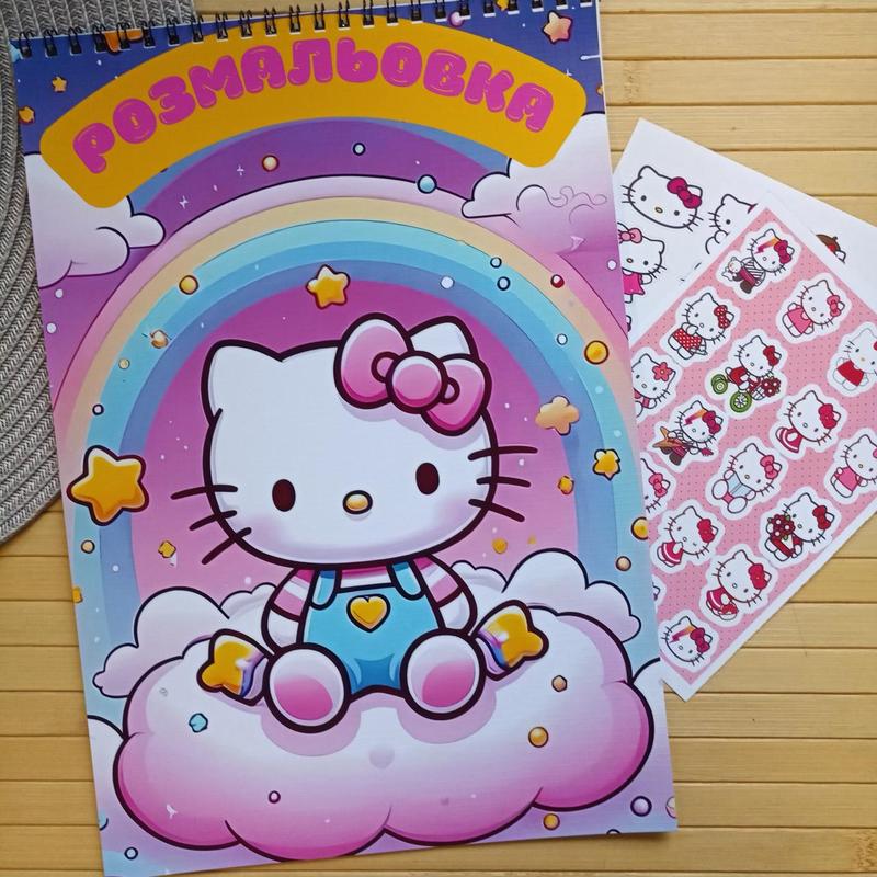 Розмальовка Hello Kitty Хелоу Кити (формат А4) Hello Kitty (від англ. «Привіт, киця») -- персонаж японської попкультури, маленька біла кішечка в спрощеному малюванні. Придумана компанією Sanrio в 1974 році і стала своєрідним мемом.