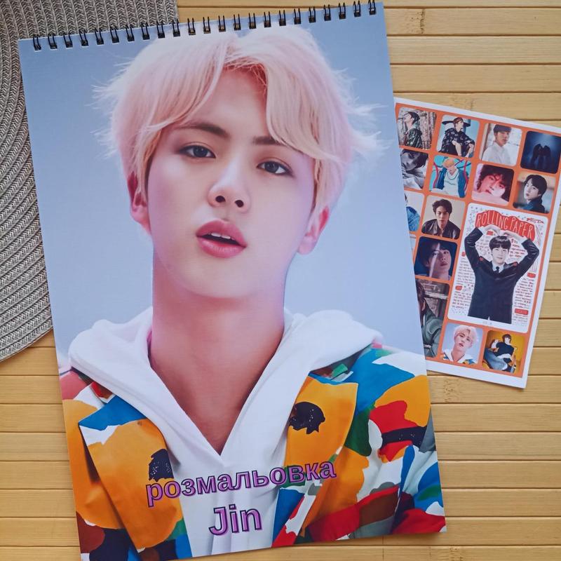 Раскраска Джин БТС Jin BTS А4 Уникальная раскраска с изображениями любимых исполнителей. Раскраска выполнена на плотной бумаге, что позволяет раскрашивать гелевыми ручками, фломастерами, акварелью. Отличный подарок поклонникам k-pop. Плотность листов 210 г Формат А4