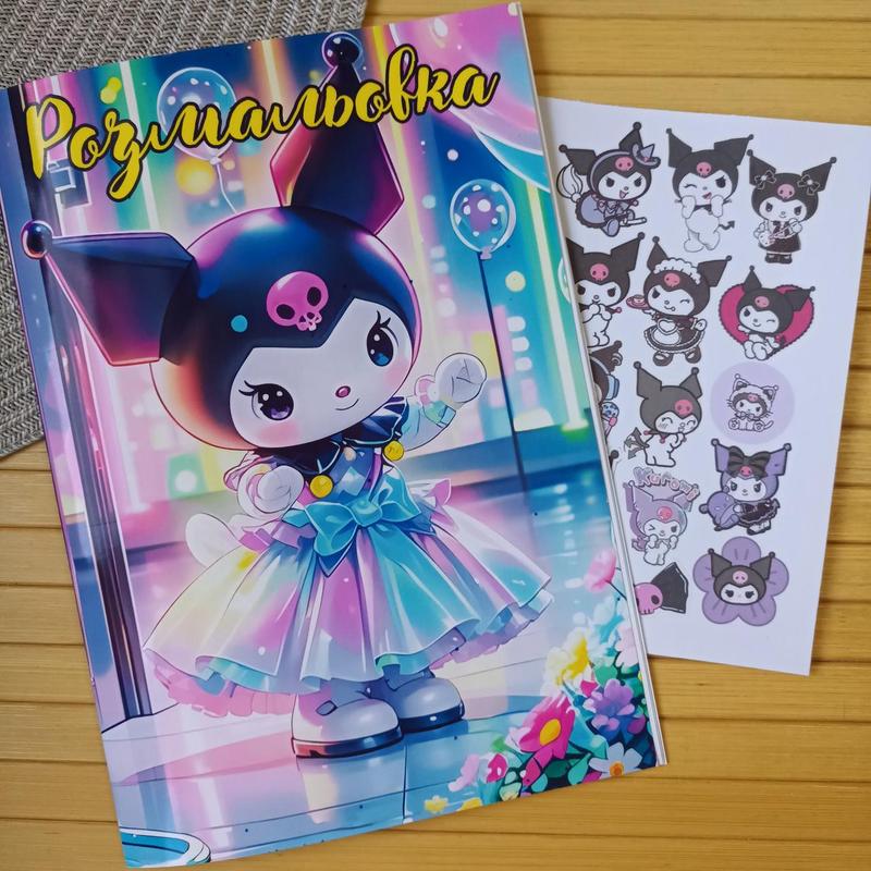 Раскраска форматом А5 на 8 изображений + стекерпак в подарок Куроми - это очаровательная девочка-демон с черным капюшоном и розовым черепом на голове, создавая контрастный и запоминающий образ. Она известна своим смелым, но хорошим характером, что делает ее привлекательной для детей и взрослых, которые любят уникальных и нестандартных персонажей.