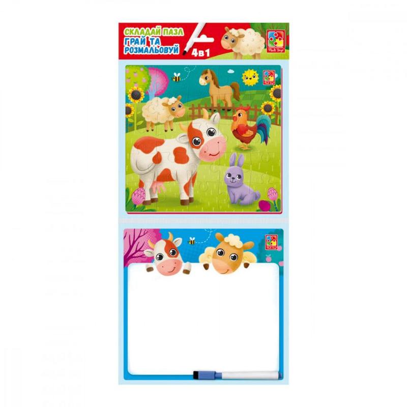 С набором 4 в 1 «Ферма» вас ждут интересные игры, задания и веселье! Составляйте яркую пазловую картинку. Выполняйте интересные задачи на доске. Пишите или рисуйте на оборотной стороне доски. Раскрашивайте рисунок. Маркер легко вытирается с поверхности ламинированной доски. Так что писать, рисовать и выполнять задания можно множество раз. Детали пазлика мягкие и приятные на ощупь. В процессе игры тренируем внимание, логическое мышление, воображение, интеллект, память. Набор содержит: маркер с губкой, пазловая картинка, раскраска, двухсторонняя доска с заданиями. Возраст: 3-5 лет.