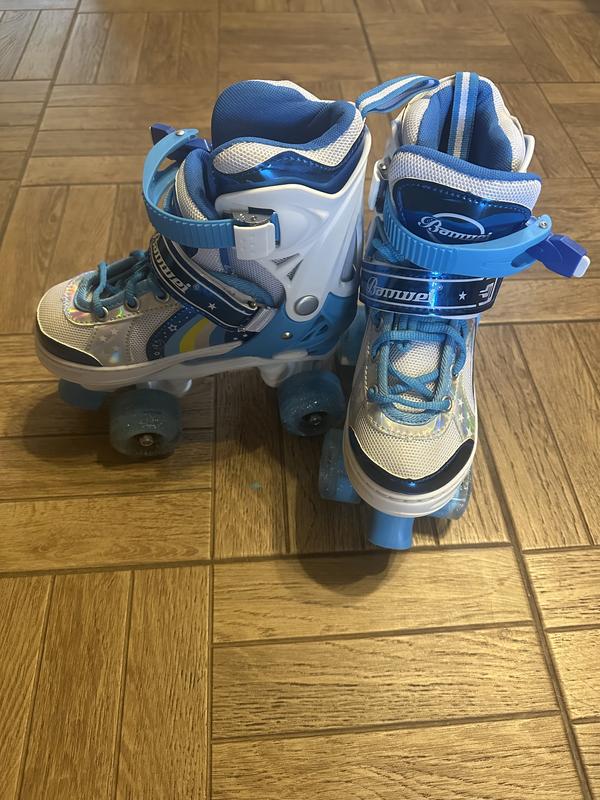 Ролики дитячі практично нові. Катались тільки дома пару разів. Колеса при їзді світяться. Ніжка по довжині регулюється по розміру. Колесика силіконові. Захист та шлем віддам у подарунок (рожевого кольору). Розмір від 19 до 21