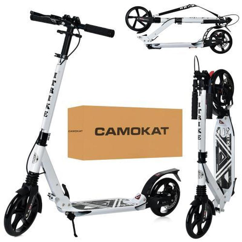 Взрос, алюм-сталь, колеса2штПУ200мм, руль89-103см, підніжка 46 / 35-14см, дискові гальма, амортизатори, замок, відбивач світла, підставка, складаний