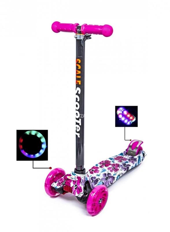 Самокат Skyper MAXI -- чудовий варіант для прогулянок та активного проведення часу! Він безпечний, оформлений у чудовому яскравому дизайні та зручний як для дитини, так і для батьків. Алюмінієве кермо самоката комплектується гумовими накладками, які не дають рукам дитини зісковзувати з нього. Також він має можливість регулюватися за висотою. Крім цього, ця модель самоката отримала функцію похилого повороту керма, а за допомогою спеціальної кнопки, його з легкістю можна від'єднати. Завдяки триколісній конструкції та здвоєному задньому колесу самокат досить безпечний і стійкий. Колеса самоката виготовлені з поліуретану, що робить катання безшумним. Якісні підшипники типу ABEC-7 сприяють швидкій і комфортній їзді. Під час катання кожне колесо світиться червоним, синім і зеленим кольором. Пластмасова дека самоката виготовлена з міцного матеріалу та кріпиться до рами. Самокат витримує навантаження до 60 кг. Для більшої безпеки самокат обладнаний ножним наступальним гальмом (step-on brake), який розміщений над задніми колесами. Характеристики: • Розміри самоката: Ширина деки -- 14 см; Мінімальна висота керма від підлоги -- 67 см, максимальна висота керма -- 90 см; • Розміри коліс: Передні колеса: діаметр -- 12 см, ширина -- 3 см; Задні колеса: діаметр -- 8 см, ширина -- 2.4 см. • Матеріали: Рама та кермо -- алюміній, Дека -- пластик, Колеса - полиуретан. Вес самоката - 2.6кг.