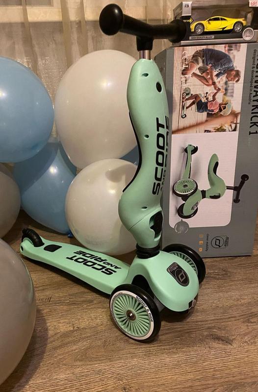 Самокат Scoot and Ride 2 в 1 Highwaykick Ash предназначен для детей ростом 82-118 см и весом до 50 кг. Самокат беговел Scoot and Ride 2 в 1 Highwaykick Ash рекомендовано для детей от 1 года. Беговел-трансформер Scoot and Ride с сиденьем имеет супер модный дизайн. Самокат трансформер 3 в 1 Scoot and Ride это новинка на рынке детского транспорта, которая входит топ 3 самых популярных самокатов. Самокат Scoot это самокат,биговел, каталка. Легко и быстро растет вместе с Вашим ребенком, адаптируясь под рост малыша, или в каталку, помогая ему делать первые шаги уверенно. Scoot and Ride – самокат, получивший сертификат соответствия европейской безопасности EN71 и прошедший множество международных тестов на качество. Самокат Scoot and Ride 2 в 1 Highwaykick самый популярный самокат на сегодняшний день. Трехколесный самокат Scoot and Ride с сиденьем стал еще более стильным и модным. Самокат Scoot and Ride Highwaykick легко и быстро трансформируется в велобег или самокат, адаптируясь под рост ребенка, или в каталку, помогая малышу делать первые шаги весело и интересно. Универсальный транспорт способствует развитию мышц и равновесия, укреплению координации движений. Самокат-каталка Scoot and Ride отличный подарок для детей от 1 года, который с 2 лет легко трансформируется в самокат без особых усилий. Трехколесный самокат-трансформер Scoot and Ride имеет специальное устройство, которое защищает ребенка от переворачивания через руль. Главное отличие Highwaykick-1 от других самокатов с сиденьем: сиденье не нужно куда-то убирать или носить в руках. Оно переворачивается вверх и становится частью рулевой колонки самоката, а рукоятка снимается и устанавливается в верхнюю часть сиденья, что добавляет ему необычного, эффектного дизайна и сразу выделяет среди многих других. Чтобы переключиться с самоката в режим каталки нужно отжать спереди черный рычаг и вернуть рулевую колонку. Отдельно можно докупить шлем под цвет самоката, который легко регулируется в объеме, как блайзер. Характеристики: Рекомендуемый возраст: от 1 до 5 лет Рост: от 82 до 118 см Максимальная нагрузка: 20 кг на сиденье, 50 кг на платформу самоката Регулируемая высота руля: от 57 до 64 см Регулируемая высота сиденья: от 22 до 29 см. Тормоз: ножной Диаметр переднего колеса: 12 см Диаметр заднего колеса: 8 см Материал передних колес: полиуретан Материал колес задний: термопластичная резина Тип колес: литые Материал рамы: алюминий Размер упаковки: 58 х 27 х 20 см Вес в упаковке: 3,7 кг Вес самоката: 2,8 кг. Производитель Scoot&Ride (Австрия) Товар оригинальный